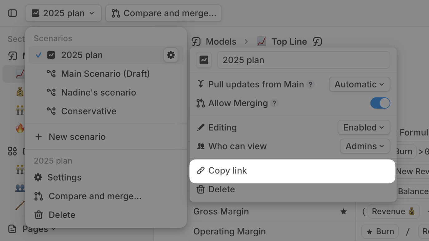 - Compare & merge — merges your edits into the main scenario. (Admins only.)