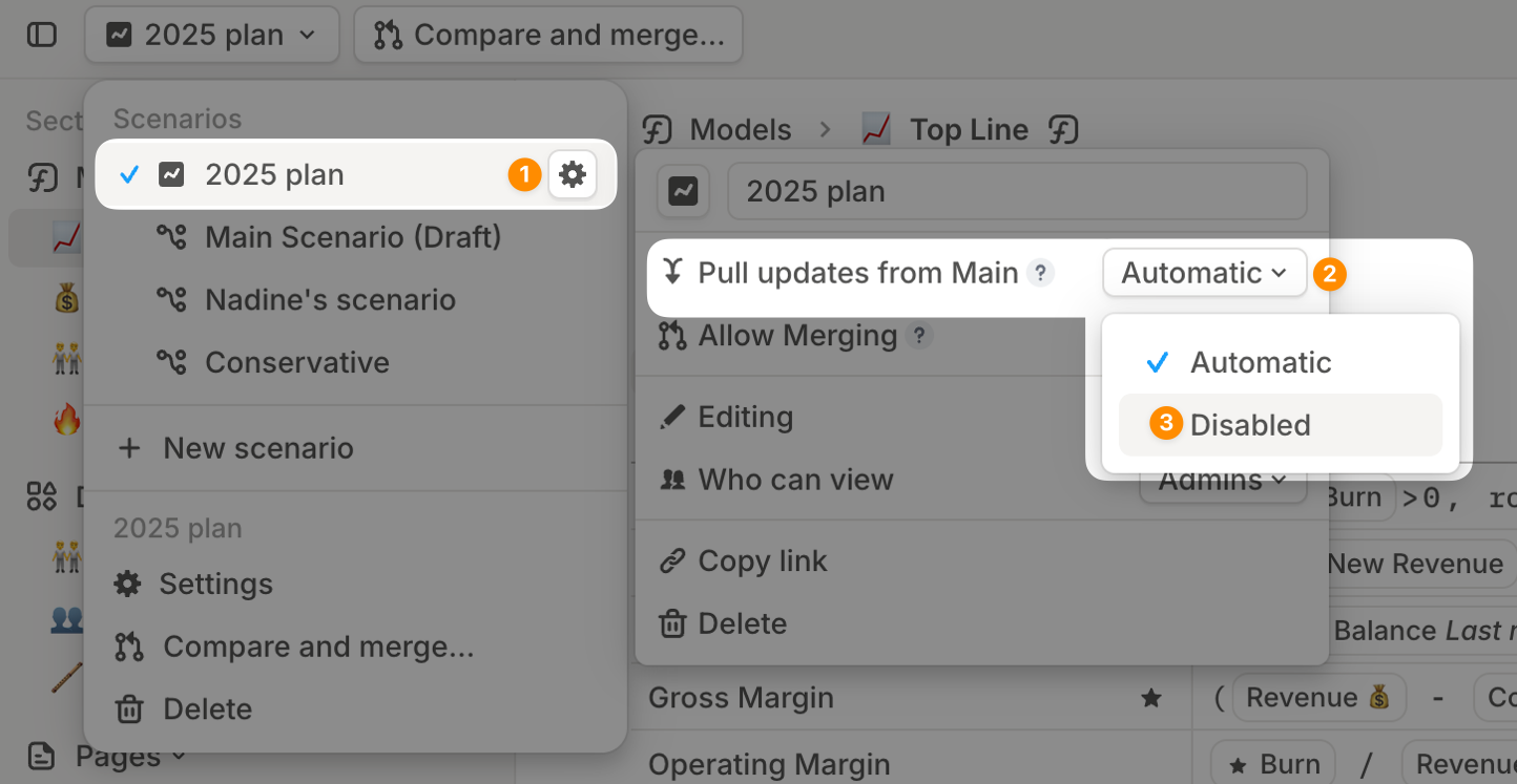 By default, all scenarios inherit updates from main unless they conflict with existing edits in that scenario. To prevent this, click the Settings icon next to a scenario name, then set Pull updates from Main to Disabled. After this, changes merged into main—including integration syncs—won’t affect this scenario.