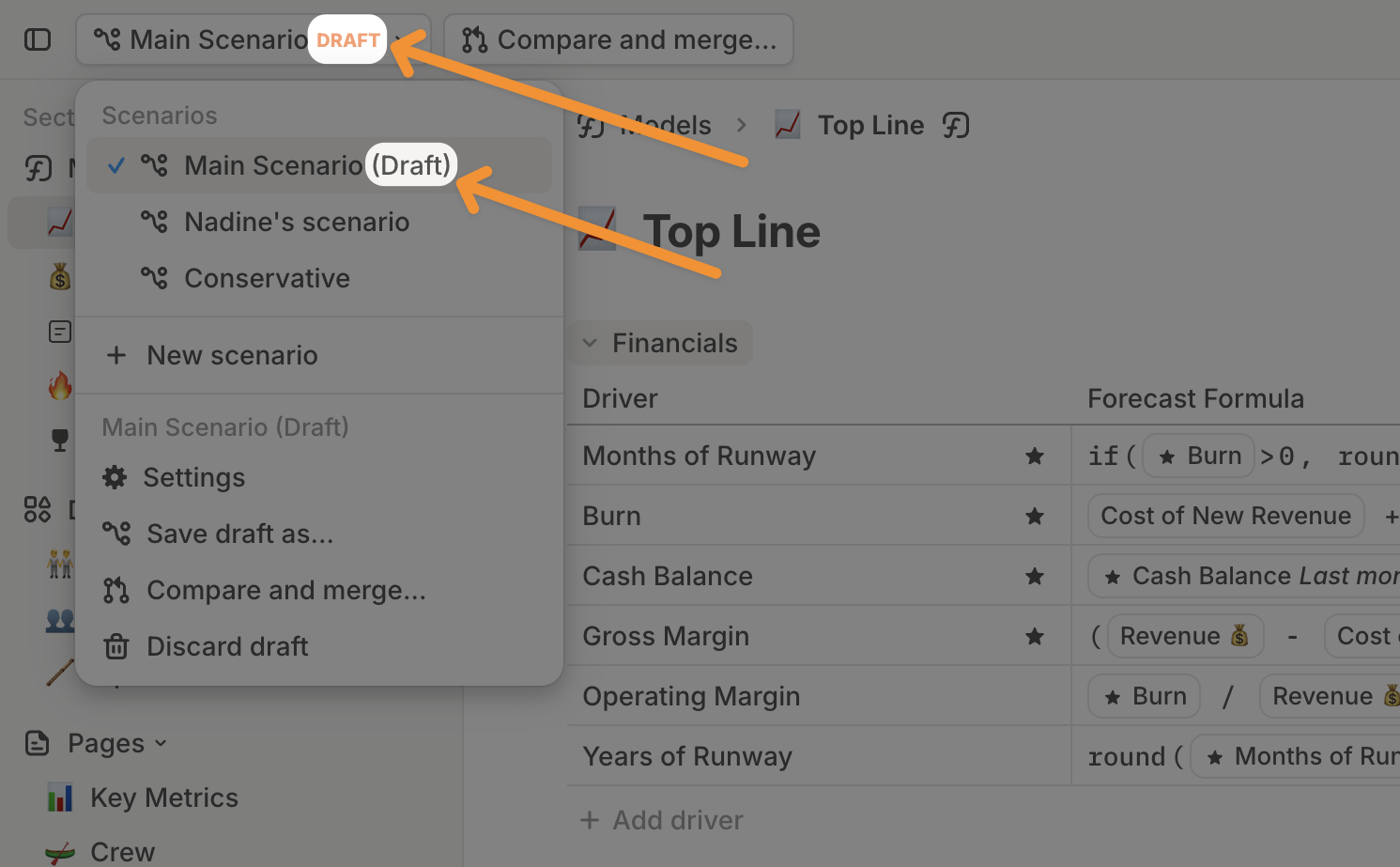 Your main scenario is your live, official model. To protect it from accidental changes, Runway automatically creates a draft scenario anytime you make data edits. Once in draft, all your edits remain local—they won’t affect main or any other scenario unless you merge them.