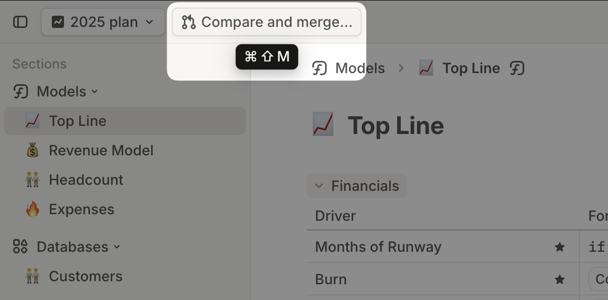 - Click Compare and merge (top left). This will let you compare it against main scenario.