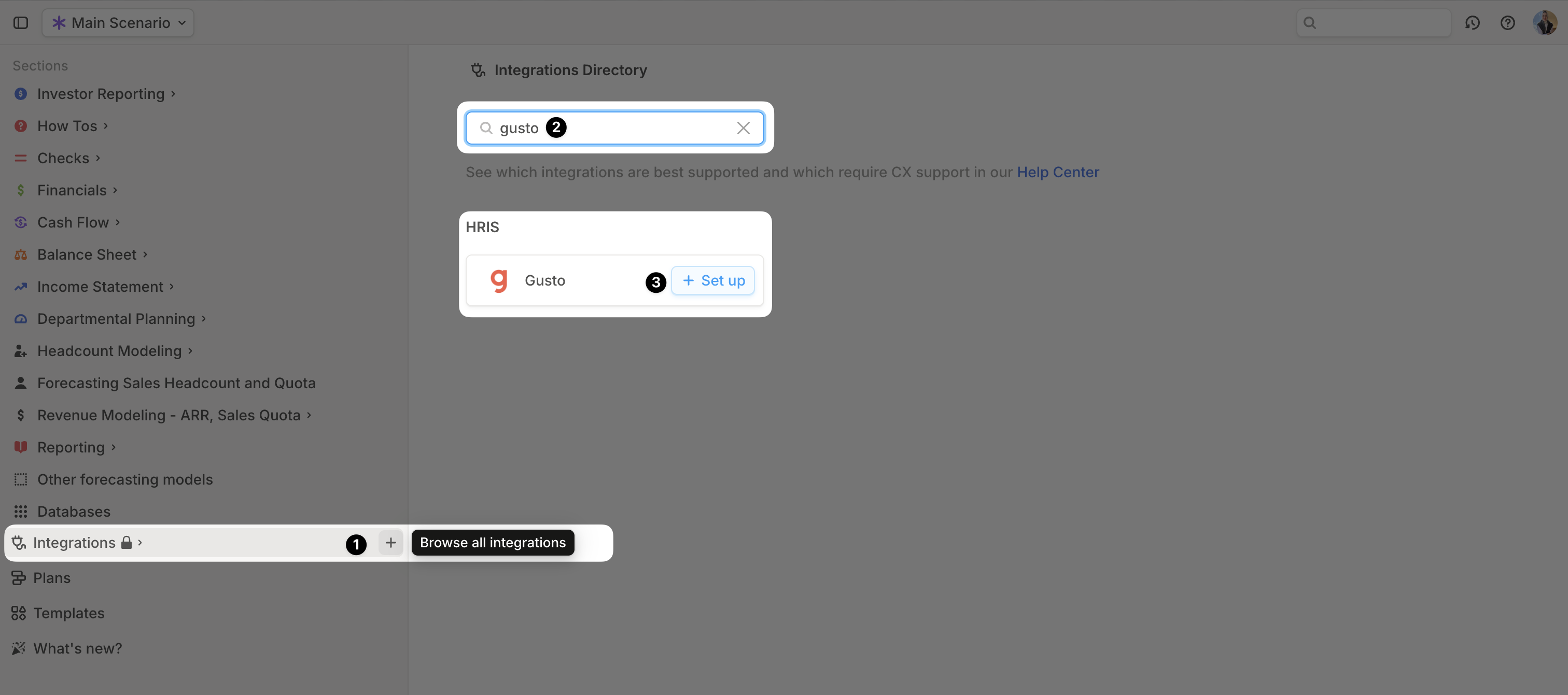 - Search for Gusto and click + Set up under the HRIS option.